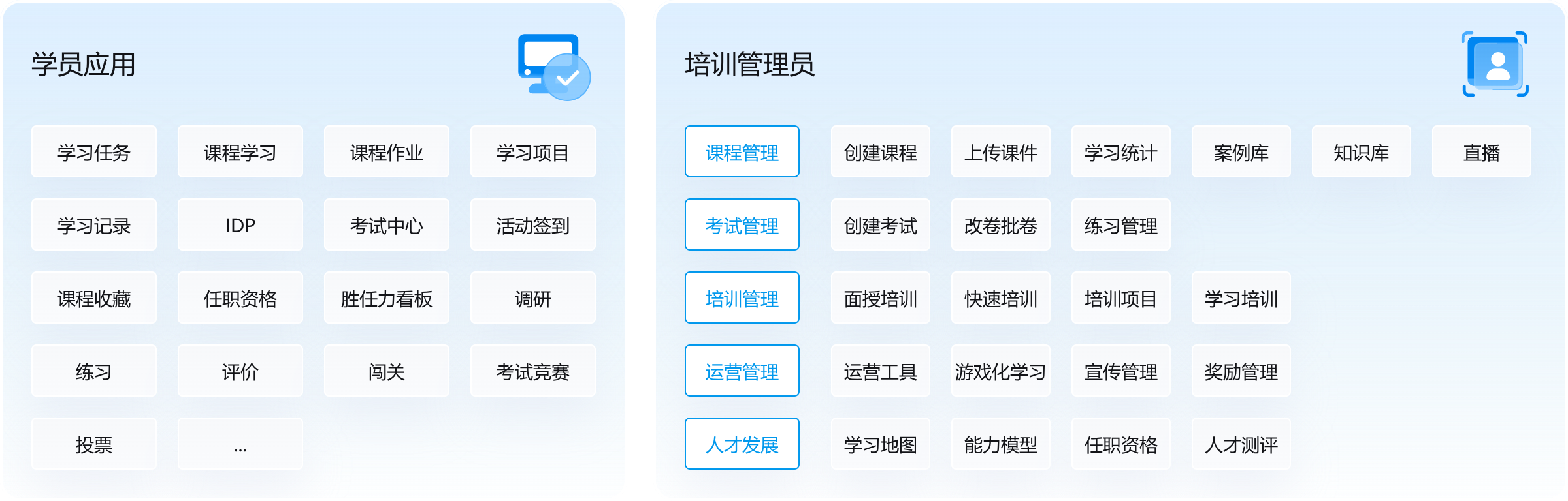 模块化、集成化、可编辑的常用功能,一键完成培训班、培训项目、专题培训、混合式培训等日常培训管理工作,功能模块自由配置。